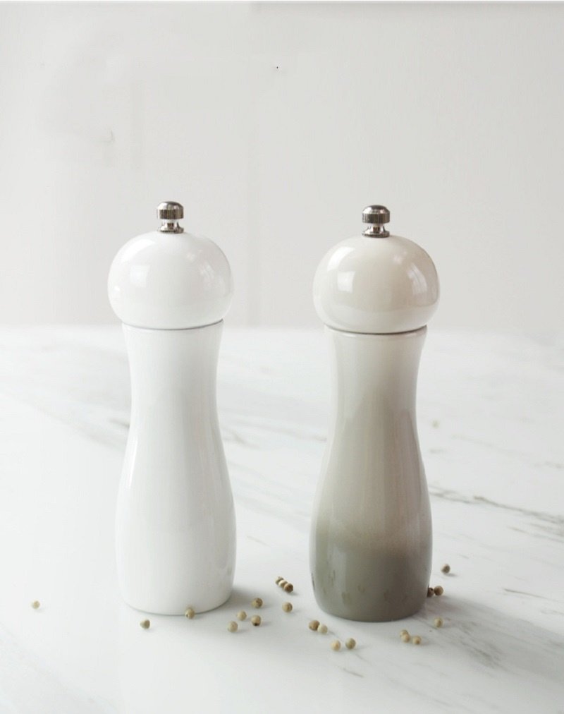 The two different colors of White and Light Grey grinders can be easily identified as the sea salt grinder and pepper mill.