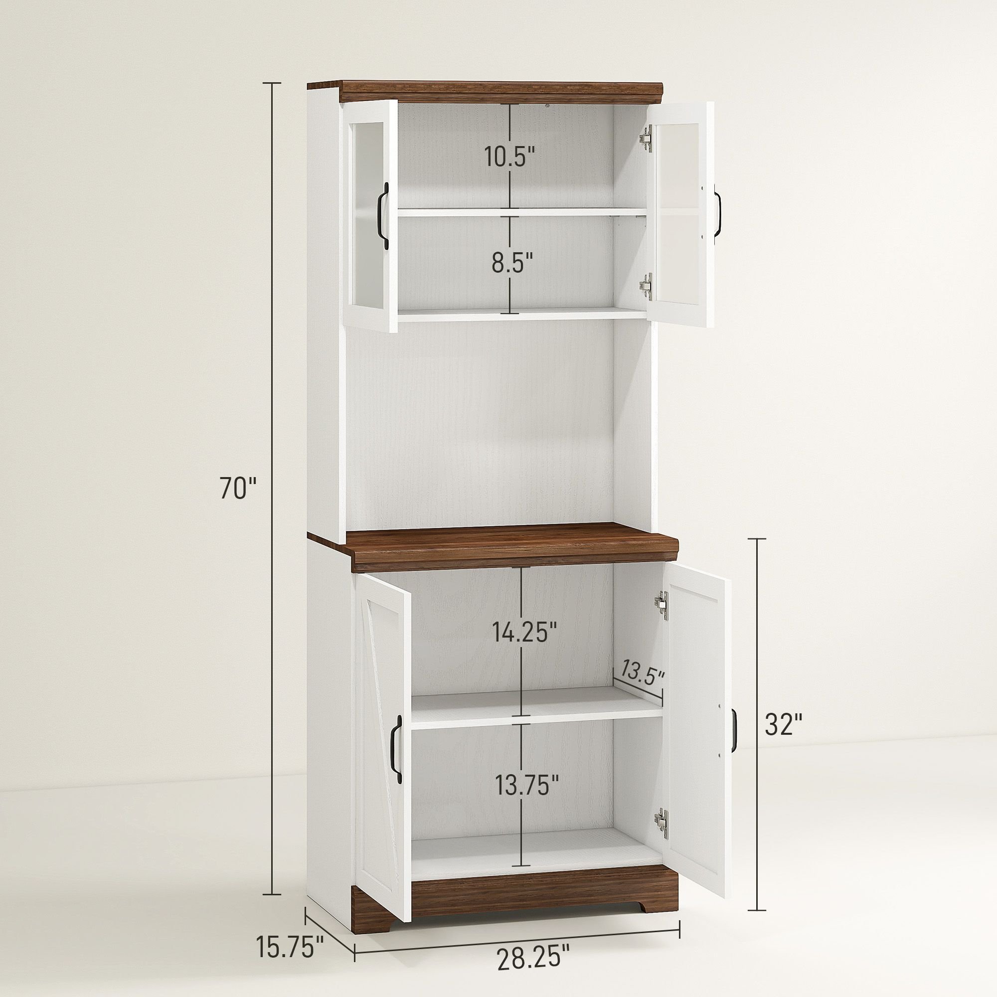 3.- Inviting Design: The barn door panels, wood countertop, and black metal handles lend this kitchen storage cabinet a tasteful farmhouse style, while the glass upper doors allow for clear visibility and help prevent dust from accumulating